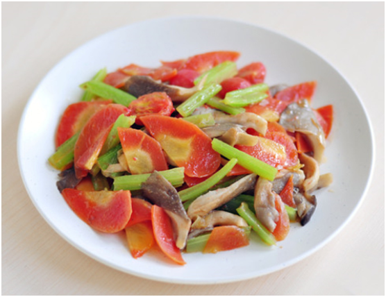 這個(gè)快手小炒菜,不僅清淡爽口,還含有豐富的維生素。準(zhǔn)備西芹、胡蘿卜、蘑菇和小番茄,烹制的次序比較講究,炒鍋燒油,下大蔥炒香后先放胡蘿卜翻炒片刻,放蘑菇翻炒,放芹菜段繼續(xù)翻炒(放一點(diǎn)點(diǎn)生抽,既去除蘑菇的腥味又可讓芹菜入味),最后放入小番茄翻炒至出水即可。
