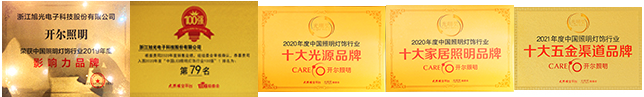 浙江旭光已申請各類專利突破70項,授權(quán)專利30余項,并獲ISO9001:2015質(zhì)量管理體系和ISO14001:2015環(huán)境管理體系認證。近年來,浙江旭光(開爾照明)已相繼獲得“浙江省社會福利企業(yè)”、“浙江省照明電器行業(yè)快速城成長企業(yè)”、“浙江省科技型中小企業(yè)”、“浙江省工商企業(yè)信用AA級守合同重信用單位”、“十大光源品牌”、“中國照明燈飾行業(yè)100強”、“全品類影響力品牌”、“家居照明潛力品牌”等幾十項政府和行業(yè)頒發(fā)的榮譽獎項。