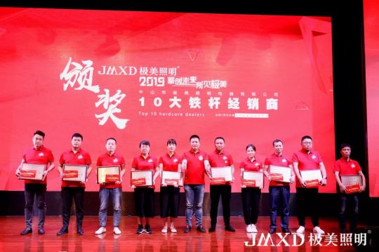 緊接著,舉行了隆重的頒獎環節。“十大潛力經銷商”、“十大鐵桿經銷商”、“十大優秀經銷商”、“十大核心經銷商”悉數登臺亮相。獲獎經銷商代表的訪談環節,他們都對極美照明充滿信心,對鄒總表示感恩。