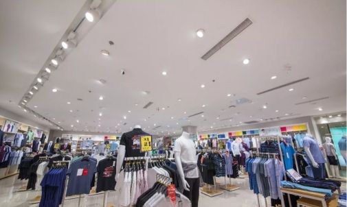 海瀾之家與紅豆專賣店內部的共同特點是服飾產品多,空間范圍有限。如果燈光運用不當,會帶來雜亂、狹窄的視覺感受,進而躁動顧客情緒,影響購物體驗?;诳臻g與陳列特點,雷士選用高光效防眩筒燈與可調角度的射燈組合,明亮的光讓空間顯得更加寬敞整潔,營造出舒適的購物氛圍。