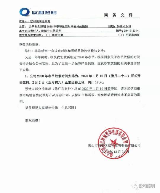 2019年12月31日,佛山市順德區(qū)歐和照明電器有限公司發(fā)布《2020年春節(jié)放假通知》稱,2020年春節(jié)已經(jīng)臨近,根據(jù)國(guó)家關(guān)于春節(jié)放假的時(shí)間安排并結(jié)合公司實(shí)際,且為了更進(jìn)一步保障產(chǎn)品供應(yīng),歐和照明現(xiàn)就春節(jié)放假的相關(guān)事宜作如下安排: