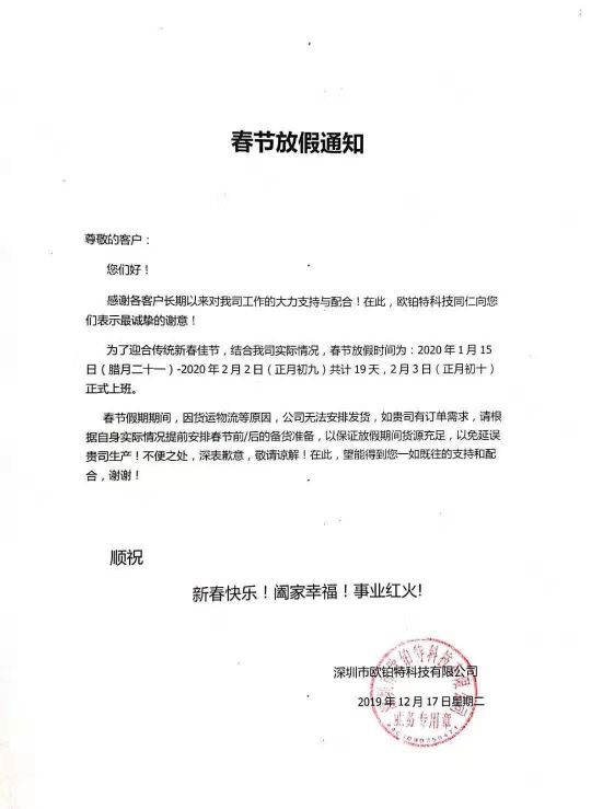 2019年12月17日,深圳市歐鉑特科技有限公司發(fā)布《春節(jié)放假通知》稱,歐鉑特春節(jié)放假時(shí)間為2020年1月15日(臘月二十一)—2020年2月2日(正月初九),共計(jì)19天;2月3日(正月初十)正式上班。