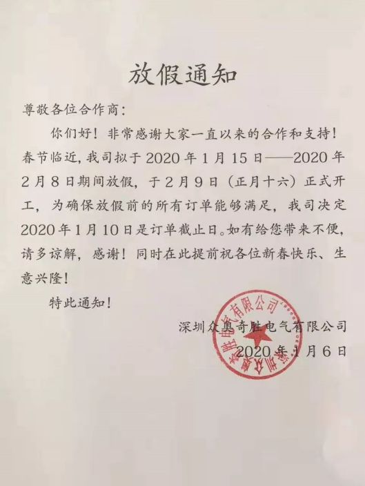 1月6日,深圳眾奧奇勝電氣有限公司發(fā)布《放假通知》稱,眾奧奇勝擬于2020年1月15日—2020年2月8日期間放假,于2月9日(正月十六)正式開工。