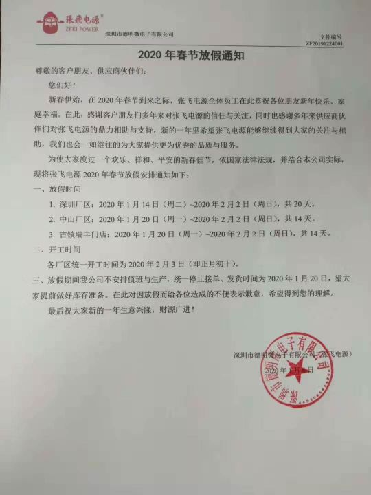 1月6日,深圳市德明微電子有限公司(張飛電源)發(fā)布《2020年春節(jié)放假通知》。通知顯示,張飛電源不同廠區(qū),放假時(shí)間有所不同,但開工時(shí)間統(tǒng)一為2月3日。