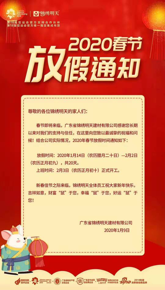 1月9日,廣東省錦繡明天建材有限公司對(duì)外公布其《2020春節(jié)放假通知》稱,結(jié)合公司實(shí)際情況,錦繡明天2020年春節(jié)放假時(shí)間為2020年1月14日(農(nóng)歷臘月二十日) —2月2日(農(nóng)歷正月初九),共20天, 2月3日(農(nóng)歷正月初十)正式開工。