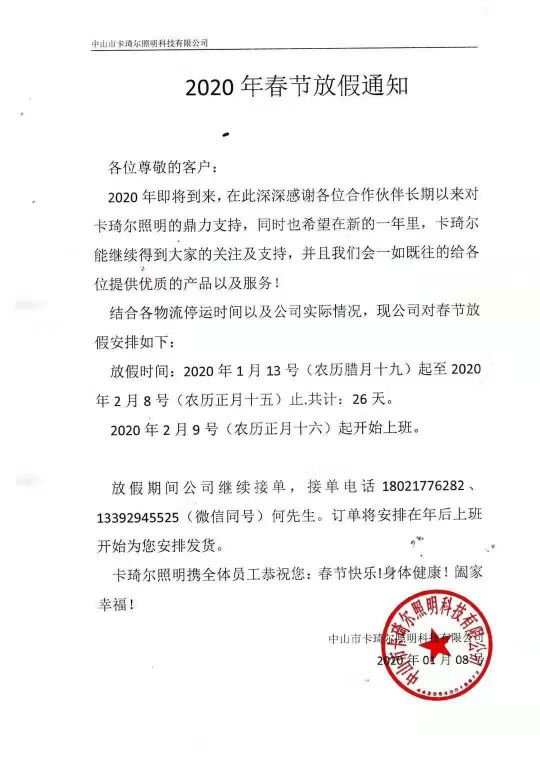 1月8日,中山市卡琦爾照明科技有限公司公布其“2020年春節(jié)放假通知”。據(jù)通知顯示,結(jié)合各物流停運(yùn)時(shí)間以及公司實(shí)際情況,卡琦爾決定于 2020年1月13號(hào)(農(nóng)歷臘月十九)至2020年2月8號(hào)(農(nóng)歷正月十五)放假,共計(jì)26天。