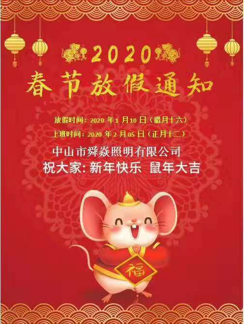 中山市舜焱照明有限公司通過一張海報(bào)公布了舜焱照明“2020春節(jié)放假安排”。據(jù)海報(bào)顯示,舜焱照明放假時(shí)間為2020年1月10日(臘月十六);上班時(shí)間為2020年2月5日(正月十二)。
