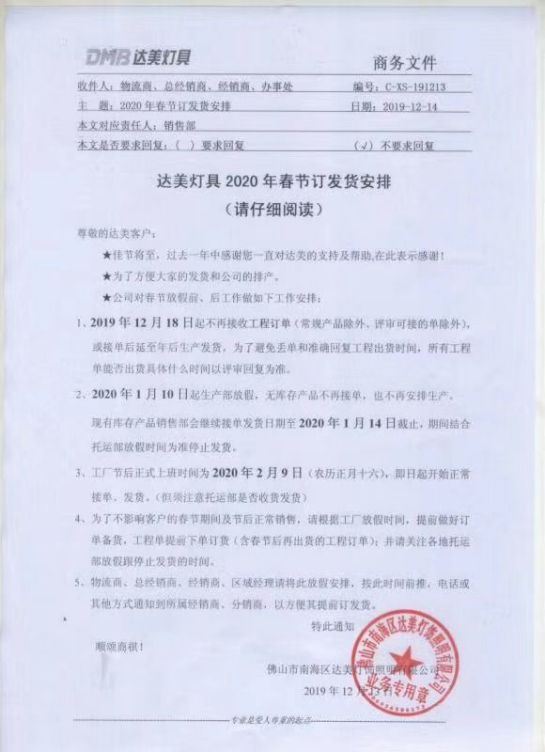 2019年12月13日,佛山市南海區(qū)達(dá)美燈飾照明有限公司公布企業(yè)2020年春節(jié)訂發(fā)貨安排。據(jù)通知單顯示,達(dá)美燈具2019年12月18日起不再接收工程訂單(常規(guī)產(chǎn)品除外、評(píng)審可接的單除外),或接單后延至年后生產(chǎn)發(fā)貨。為了避免丟單和準(zhǔn)確回復(fù)工程出貨時(shí)間,所有工程單能否出貨具體什么時(shí)間以評(píng)審回復(fù)為準(zhǔn)。
