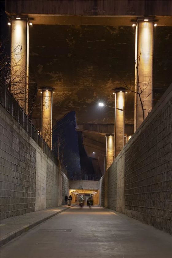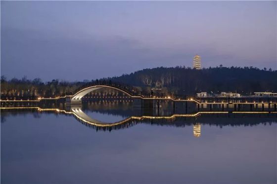 張公山公園以自然山體森林和水體景觀為載體, 構建出傳統園林式開放空間。園內的望淮塔作與湖上棧橋遙相呼應,風景美不勝收。綠樹、橋、塔等景觀被 燈光一一照亮,通過水之載體呈現出豐富的倒影。