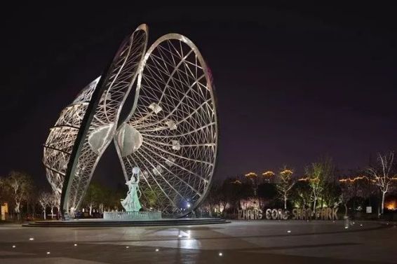 園內太極廣場的鋼架雕塑造型獨特,密布的點狀光源,以點成面變換著別樣色彩,為廣場增添動態之美。
