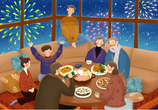 觥籌交錯,推杯換盞;氣氛高漲,興致勃勃!大家聊著從前的趣聞,談著未來的計劃,談笑風生直至深夜。窗外璀璨的煙火與屋內明媚的燈光交相輝映,營造出溫暖且動人的氛圍!
