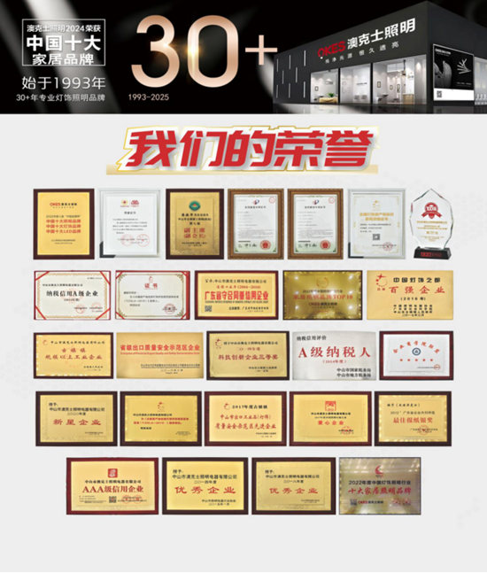 澳克士照明扎根中山古鎮(zhèn)燈都,從1993年建廠,發(fā)展至今已30多年,先后榮獲“廣東省守合同重信用企業(yè)”“古鎮(zhèn)鎮(zhèn)規(guī)模以上工業(yè)企業(yè)”、“十大家居照明品牌”、“中珠江澳十大牛商”等各項殊榮,作為與澳克士照明共同成長的經(jīng)銷商,在企業(yè)發(fā)展的過程中,不管是品牌戰(zhàn)略布局,還是技術創(chuàng)新培育,以及市場攻堅克難,都離不開他們的陪伴與堅守。