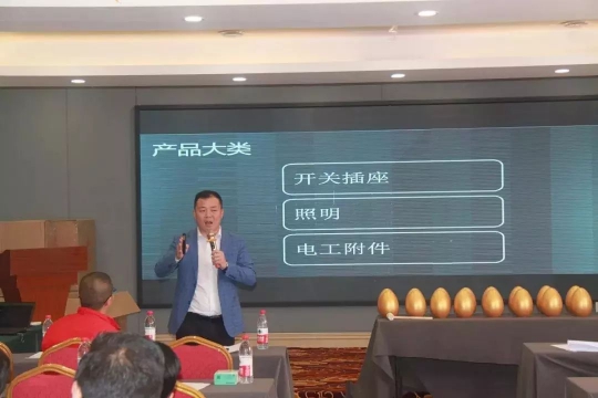 福田電器照明事業(yè)部經(jīng)理蔣春林和銷售部經(jīng)理李金武分別針對2019年春季福田電器的照明新品和電工新品做了推介分享。