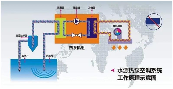 水源熱泵是一種清潔、高效、節(jié)能、環(huán)保、可再生的新能源技術(shù),利用地球表面或淺層水源,以及人工再生水源的低位熱能,采用熱泵原理,通過(guò)消耗少量的電能,實(shí)現(xiàn)低位熱能向高位熱能轉(zhuǎn)移的一種技術(shù)。冬季,把存儲(chǔ)在水體中的熱量“取”出來(lái),轉(zhuǎn)換后供給室內(nèi)采暖;夏天,把室內(nèi)的熱量釋放到水體中達(dá)到室內(nèi)制冷的目的。