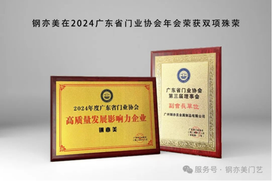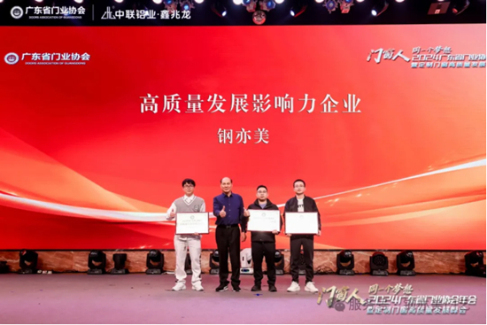 2024年12月30日,在廣東省門業協會主辦的“門窗人·同一個夢想——2024廣東省門業協會年會暨定制門窗高質量發展峰會”上,廣州鋼亦美門業有限公司成為了矚目的焦點,一舉榮獲高質量發展影響力企業獎,并榮升副會長單位。