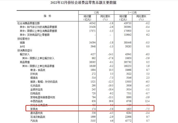 前不久,國家統計局公布了2022年12月國民經濟運行情況。數據顯示,12月份,社會消費品零售總額為40542億元,同比下降。2022全年,社零總額為439733億元,比上年下降。而2022年家具類零售總額 為1635億元,同比下降,依然位列倒數第一 。