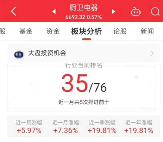 2月21日數據顯示,廚衛電器板塊近一周漲幅5.97%,近一月漲幅7.36%,近一季漲幅19.81%。