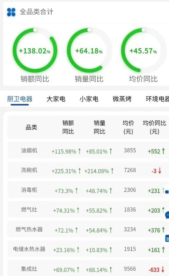 其中,集成灶銷售額和銷量同比增長69.07%、88.14%,洗碗機銷售額和銷量同比增長225.31%、214.08%,油煙機銷售額和銷量同比增長115.98%、85.01%。