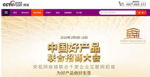 2015年經濟面臨下行壓力,中小企業迫切需要打開營銷局面。央視網商城以為中小企業成長創造機遇,提升產品品牌價值,升級商業理念,助推中國夢為使命,聯合千家企業于2016年1月8日至18日召開“中國好產品聯合招商大會”,打造優質產品互聯網招商分銷管理平臺,包括食品茶飲、家居用品、護膚彩妝、服裝鞋帽、3C數碼、家用電器等行業全品類,提供產品發布、品牌推廣、渠道拓展、微商營銷等一站式整合營銷配套服務。