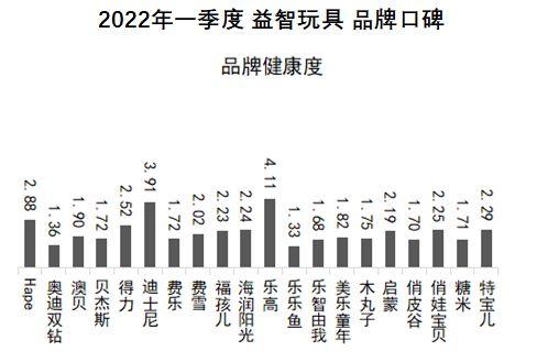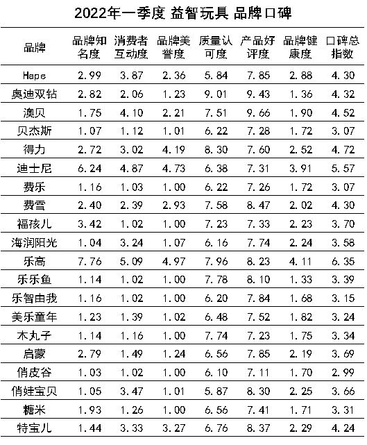 報告顯示,樂高、迪士尼、得力在口碑總指數中位居前三。澳貝、奧迪雙鉆、費雪、Hape、特寶兒、福孩兒、啟蒙分列第四至第十位。
