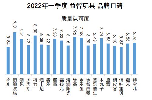 質量認可度方面,奧迪雙鉆、得力、樂高位居前三。樂樂魚、木丸子、費雪、澳貝、福孩兒、特寶兒、啟蒙分列第四至第十位。