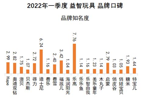 分維度來看:品牌知名度方面,樂高、迪士尼、福孩兒位居前三。Hape、奧迪雙鉆、啟蒙、得力、費雪、糖米、澳貝分列第四至第十位。