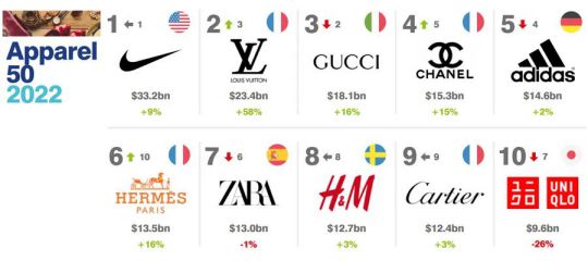 “ 英國品牌評估機構“品牌金融”(Brand Finance)發布2022“全球服裝時尚品牌價值50強”排行榜(Apparel 50 2022),耐克、路易威登和古馳名列前三位。中國五個品牌上榜,其中李寧品牌首次上榜。”