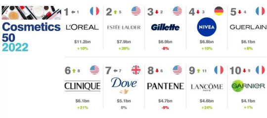 英國品牌評估機構“品牌金融”(Brand Finance)發布“2022全球化妝品和個人護理品牌價值50強”排行榜(Cosmetics 50 2022)。歐萊雅、雅詩蘭黛和吉列排名前三位。50個品牌總價值為1307億美元。美國寶潔公司、英國聯合利華集團和法國歐萊雅集團的品牌上榜最多。