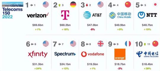 簡單介紹一下前十名,美國占4席,中國占2席,德國、日本、法國、英國各占1席。中國電信成功躋身前十,品牌價值183.74億美元,同比增長37.9%,是TOP10中漲幅最大的。去年公司實現營收4396億元,同比增長11.7%;凈利潤259.48億元,同比增長24.5%,漲幅創下16年來最高值。
