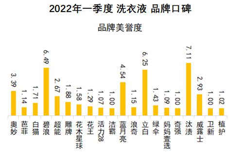 產品好評度方面,藍月亮、媽媽壹選、汰漬位居前三。綠傘、奧妙、超能、碧浪、衛新、芭菲、白貓分列第四至第十位。