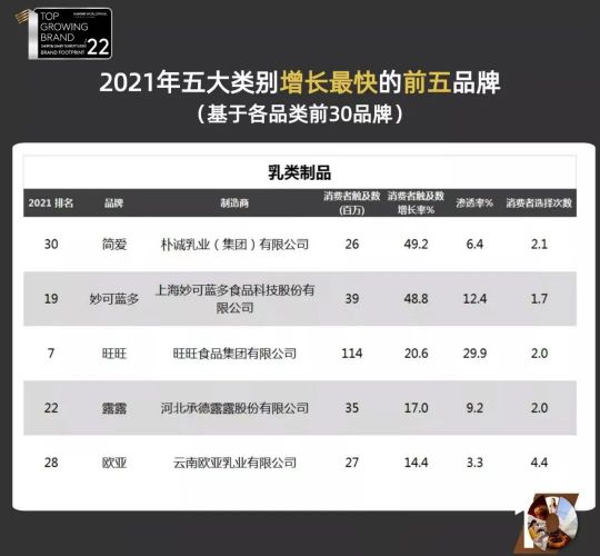 簡(jiǎn)愛是乳類制品中增長(zhǎng)最快的本土品牌,消費(fèi)者觸及數(shù)大幅增長(zhǎng)49.2%,2021年超過2700萬(wàn)中國(guó)城市家庭購(gòu)買過簡(jiǎn)愛。定位“無添加劑”,簡(jiǎn)愛滿足消費(fèi)者對(duì)于安全品質(zhì)的需求。而通過打造面向不同人群的產(chǎn)品,投資建造自己的牧場(chǎng),保障奶源更加充足,配送范圍更廣等,無論是線上渠道、新零售渠道還是線下大型零售商,簡(jiǎn)愛都獲得了強(qiáng)勁的增長(zhǎng)。