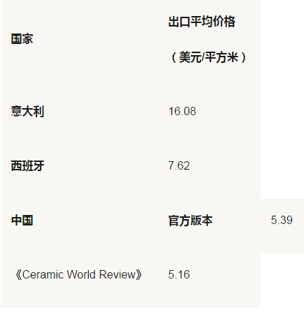 中國是世界第一大瓷磚出口大國,但這僅體現在量上,從瓷磚出口單價來看,意大利瓷磚的平均價格約為16.08美元/平方米,西班牙的平均價格約為7.62美元/平方米,而中國的瓷磚無論是官方5.39美元/平方米的平均單價,還是《Ceramic World Review》的5.16美元/平方米,都可以看到差距。