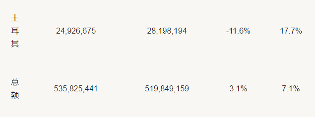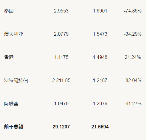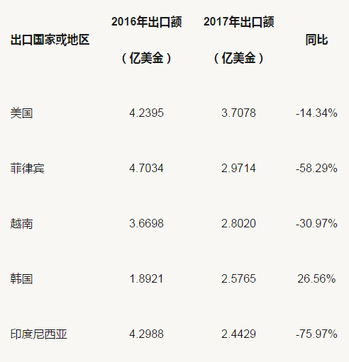 從上表可以看出,除韓國和香港的出口額在上漲外,其余8個國家出口額均在下跌。