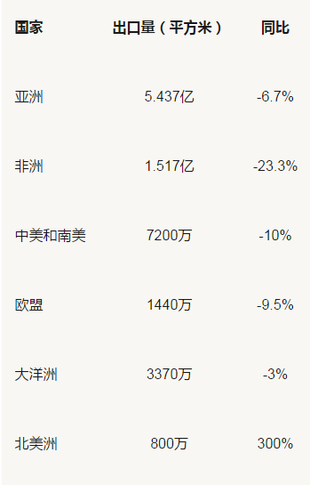 2、西班牙:出口額上漲幅度大亞洲是中國出口的主要地區,出口總量達5.437億平方米,占中國出口量的60%,其次非洲為1.517億平方米,中美洲和南美洲地區,達7200萬平方米,中國對大洋洲的出口為3370萬平方米,對歐盟和北美洲的出口分別為1440萬平方米和800萬平方米。