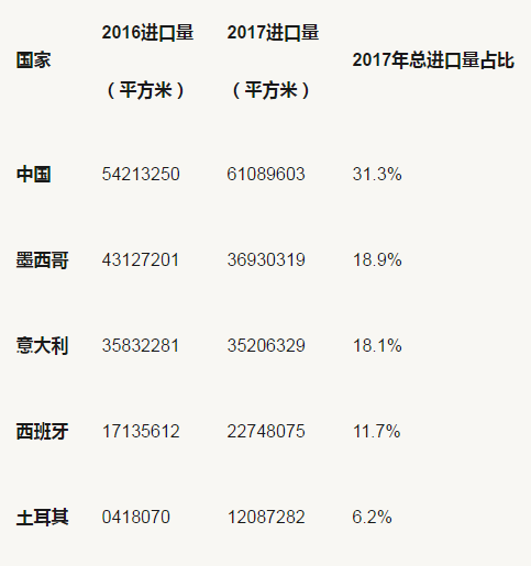 根據《Ceramic World Review》報道,2017年,美國進口了1.95億平方米的瓷磚,比2016年的1.847億平方米增加5.6%。瓷磚進口占2017年美國瓷磚消費量的68.9%,略高于2016年的68.6%。(中國、意大利、西班牙以及墨西哥、土耳其在美國市場競爭激烈,一起放進來比較。)