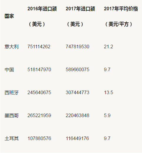 意大利是美國第三大瓷磚出口國,2016年意大利出口3520萬平方米瓷磚到美國,占美國進口量的18.1%,低于2016年的19.4%。2017年西班牙(22.7百萬平方米,同比增長32.8%)和土耳其(1200萬平方米,同比增長28.3%),占比進口份額分別為11.7%和6.2%。