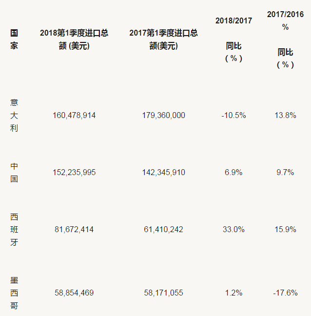國家建筑衛生陶瓷檢測重點實驗室高級工程師劉亞民日前在本平臺發布的《301調查背景下的美國陶瓷磚市場統計分析》中提到,2018年第一季度意大利仍然是美國最大進口國(按2018年第一季度計算),占美國進口的29.9%;中國排名第二,占28.4%,西班牙排名第三,占15.2%。