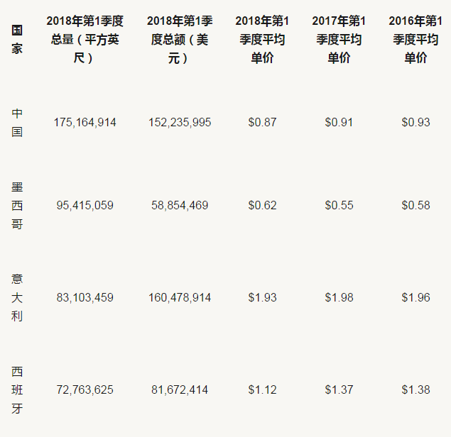 美國陶瓷磚季度進口單價統計分析根據進口量和進口額(包括關稅,運費和保險)統計分析,美國2018年第一季度平均單價是1.02美元/平方英尺,在進口量最多的5個國家中,進口單價最高的是意大利(1.93美元/平方英尺)、最低的是墨西哥(1.02美元/平方英尺)。