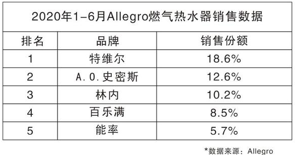 據(jù)Allegro于7月13日公布的平臺(tái)燃?xì)鉄崴麂N(xiāo)售情況顯示,位列Allegro平臺(tái)零售TOP5的品牌分別是特維爾、A.O.史密斯、百樂(lè)滿(mǎn)、林內(nèi)和博世,其中,特維爾以18.6%的網(wǎng)絡(luò)零售額位列榜單首位,A.O.史密斯、百樂(lè)滿(mǎn)分別以12.6%和10.2%位居二三名。