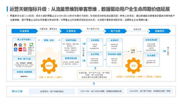 報(bào)告最后指出,受流量紅利退卻、獲客成本增加等因素影響,以規(guī)模化獲客并實(shí)現(xiàn)銷售轉(zhuǎn)化、從而帶動(dòng)GMV增長(zhǎng)的傳統(tǒng)營(yíng)銷模式變得更加困難,因此零售企業(yè)的“運(yùn)營(yíng)關(guān)鍵指標(biāo)”也在發(fā)生變化,由流量思維轉(zhuǎn)型到單客思維,數(shù)據(jù)驅(qū)動(dòng)用戶全生命周期價(jià)值延展,即專注每一位既有用戶的生命周期價(jià)值(CLV)。2.0階段,零售企業(yè)更加關(guān)注會(huì)員數(shù)、會(huì)員活躍度、客單價(jià)、復(fù)購(gòu)率、裂變率等核心指標(biāo)。