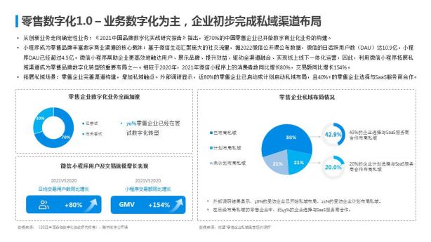 值得一提的是,此次《報(bào)告》對(duì)零售數(shù)字化發(fā)展階段做出了清晰界定。報(bào)告指出,零售數(shù)字化1.0時(shí)代即零售企業(yè)實(shí)施全渠道基建階段,其主要特征為持續(xù)性投入支撐數(shù)字化業(yè)務(wù)的基礎(chǔ)建設(shè),拓展私域場(chǎng)景的零售企業(yè)獲得業(yè)績(jī)?cè)鲩L(zhǎng)以及零售企業(yè)實(shí)施全渠道基建,推動(dòng)業(yè)務(wù)數(shù)字化。這意味著,零售數(shù)字化1.0階段,零售企業(yè)數(shù)字化主要完成從實(shí)體商業(yè)向數(shù)字商業(yè)轉(zhuǎn)型升級(jí),通過構(gòu)建線上智慧商城為線下實(shí)體門店創(chuàng)造全時(shí)全域一體化經(jīng)營(yíng)渠道,通過品牌商城的打造幫助零售企業(yè)傳遞品牌價(jià)值、構(gòu)建更多連接消費(fèi)者的觸點(diǎn)、完善和積累數(shù)字化資產(chǎn)。